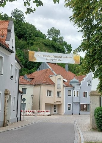 Am Sonntag darauf, den 6.7. feierte Florian Illek seine Primiz. Zur Vorbereitung auf dieses große Ereignis fanden Donnerstag, Freitag und Samstag feierliche Gottesdienste mit ausgewählten Predigern statt. Diese Predigten können Sie auf dem unten angegebenen Link nachhören und nachschauen. Nachdem der Primiziant am Elternhaus vom Liturgischem Dienst, den Vereinen, seinen Freunden und Weggefährten abgeholt worden war, wurde er in einem Kirchenzug mit Blasmusik in die Kirche geleitet, wo er seine erste hl. Messe feierte. Die Predigt hielt Herr Dirk Henning aus dem Kloster Paring, die man auch nachhören und -sehen kann. Nach der Messe feierte die Gemeinde und seine Familie und Freunde im Pfarrhof bei einem Stehempfang. Am Nachmittag um 16 Uhr gab es noch eine Dankandacht.