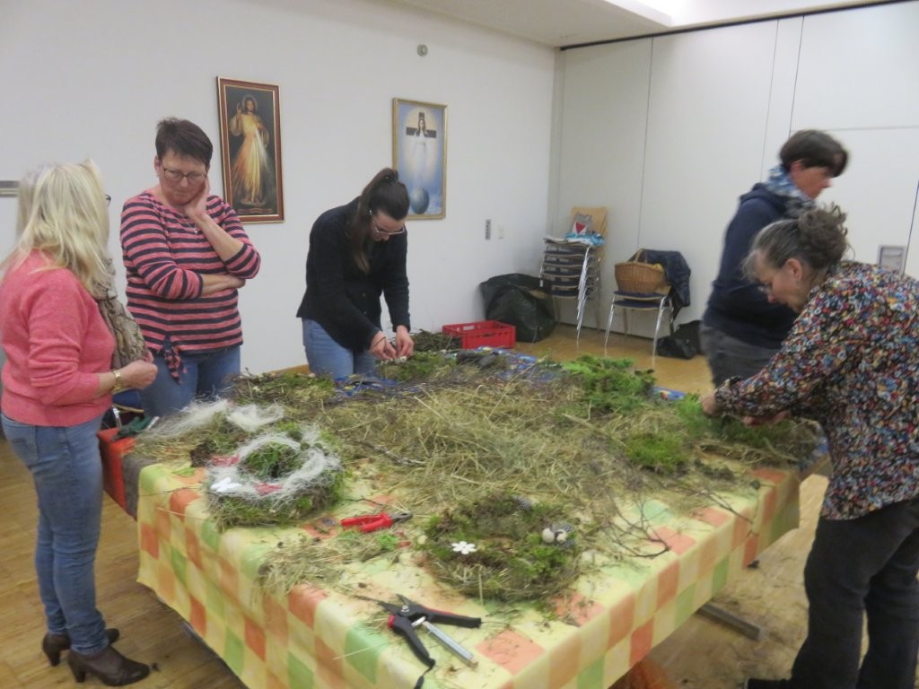 Am Dienstag ab 18.30 Uhr fand der Bastelabend des Frauenbunds im Pfarrsaal statt. Anfertigen konnte man entweder einen österlicher Türkranz oder ein Herz.