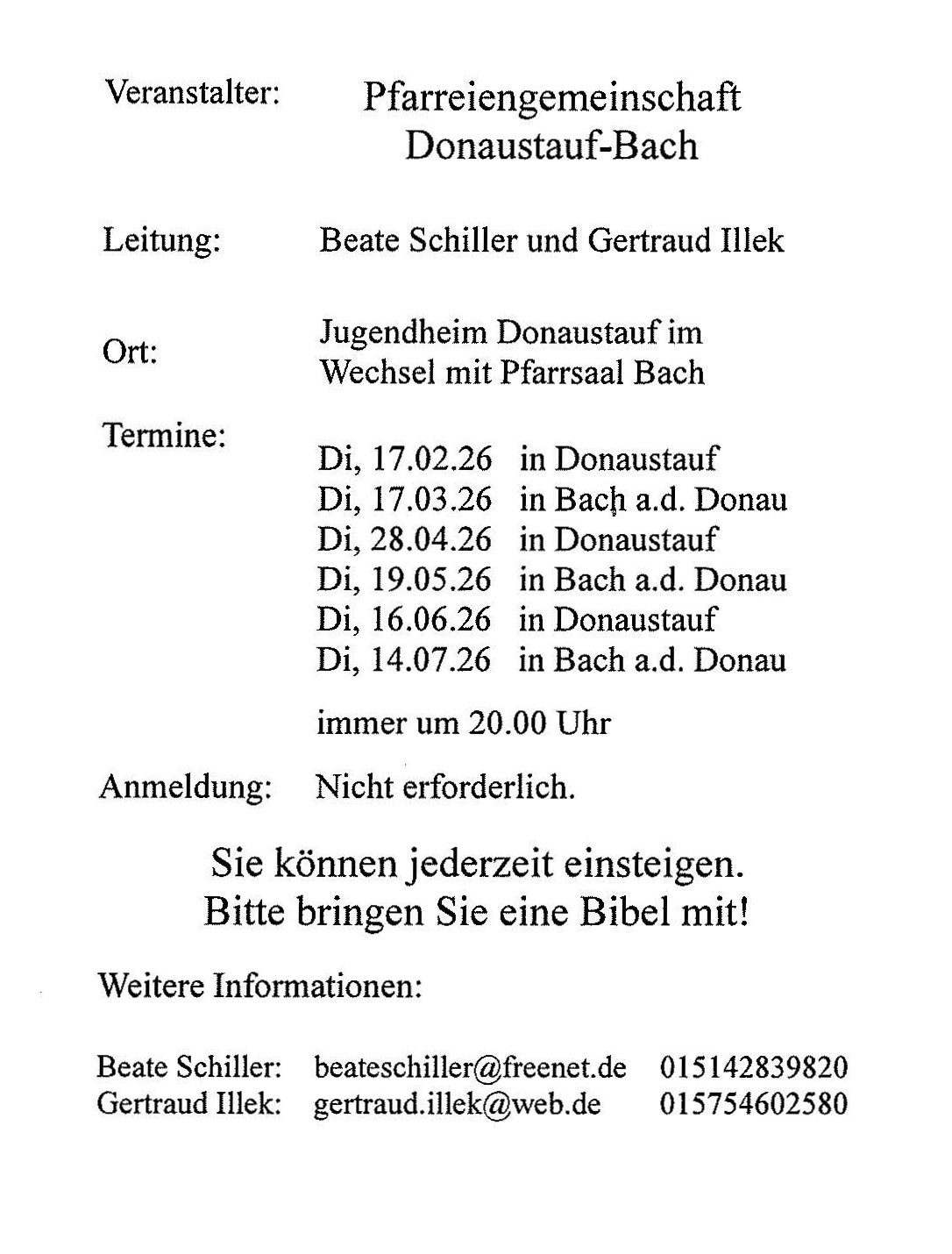 Neue Termine für Bibelgespräche (bis Juli 2026)